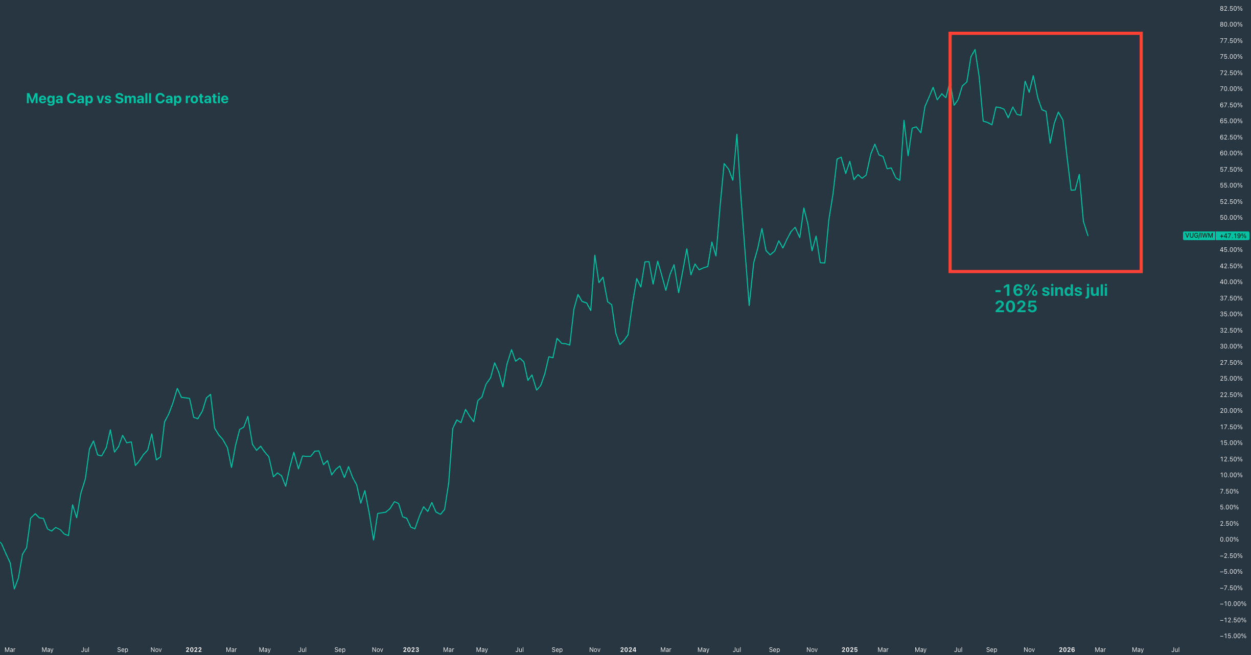 De rotatie van mega-cappers naar small-caps is volgens deze spread eigenlijk al aan de gang sinds de zomer van 2025. Waarschijnlijk omdat toen al werd geanticipeerd op renteverlagingen van de Federal Reserve.