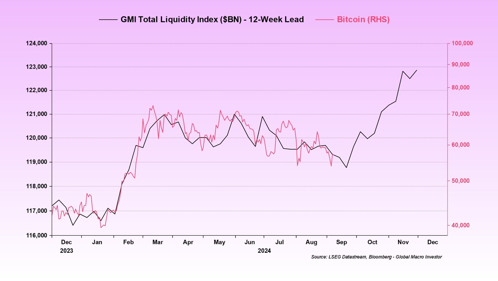 De koers van bitcoin is hier meegenomen in de vergelijking, omdat het als een van de risk-on assets positief en negatief reageert op verruiming en verkrapping van liquiditeit. Zie je waar het zwarte lijntje heengaat richting het eind van 2024? 🆙