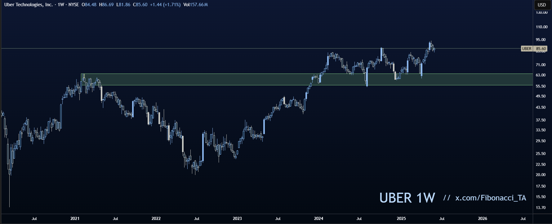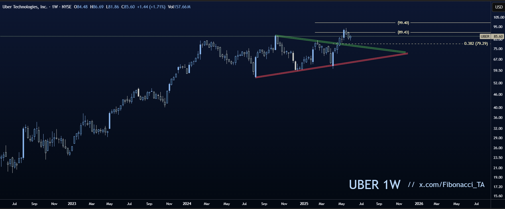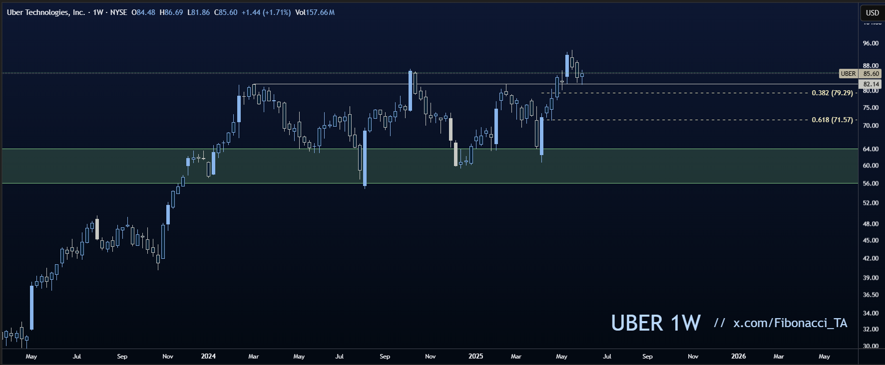 Met Fibonacci-lijnen op de weekgrafiek zien we waar de koers steun vindt in een uptrend. De twee meest voorkomende retracement-levels liggen voor Uber tussen $79 en $71,50.