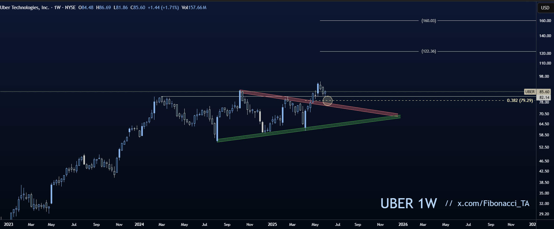De uitbraak uit de wedge is bevestigd, met een hertest rond $80 als cruciaal moment. Houdt die zone stand, dan ligt $122 – en daarna $160 – in het vizier.