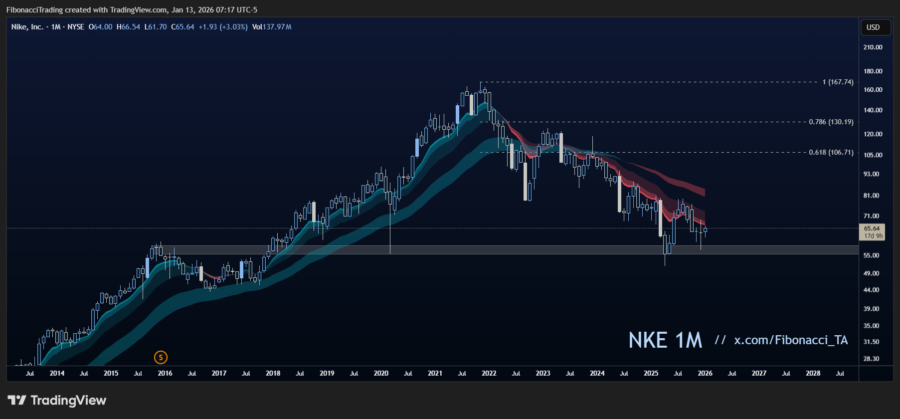 Ik heb een interessant gebied ingetekend tussen $55-$60. Dit niveau komt uit 2016, waar we een top maakten die we pas in 2020 definitief wisten te breken en te houden.