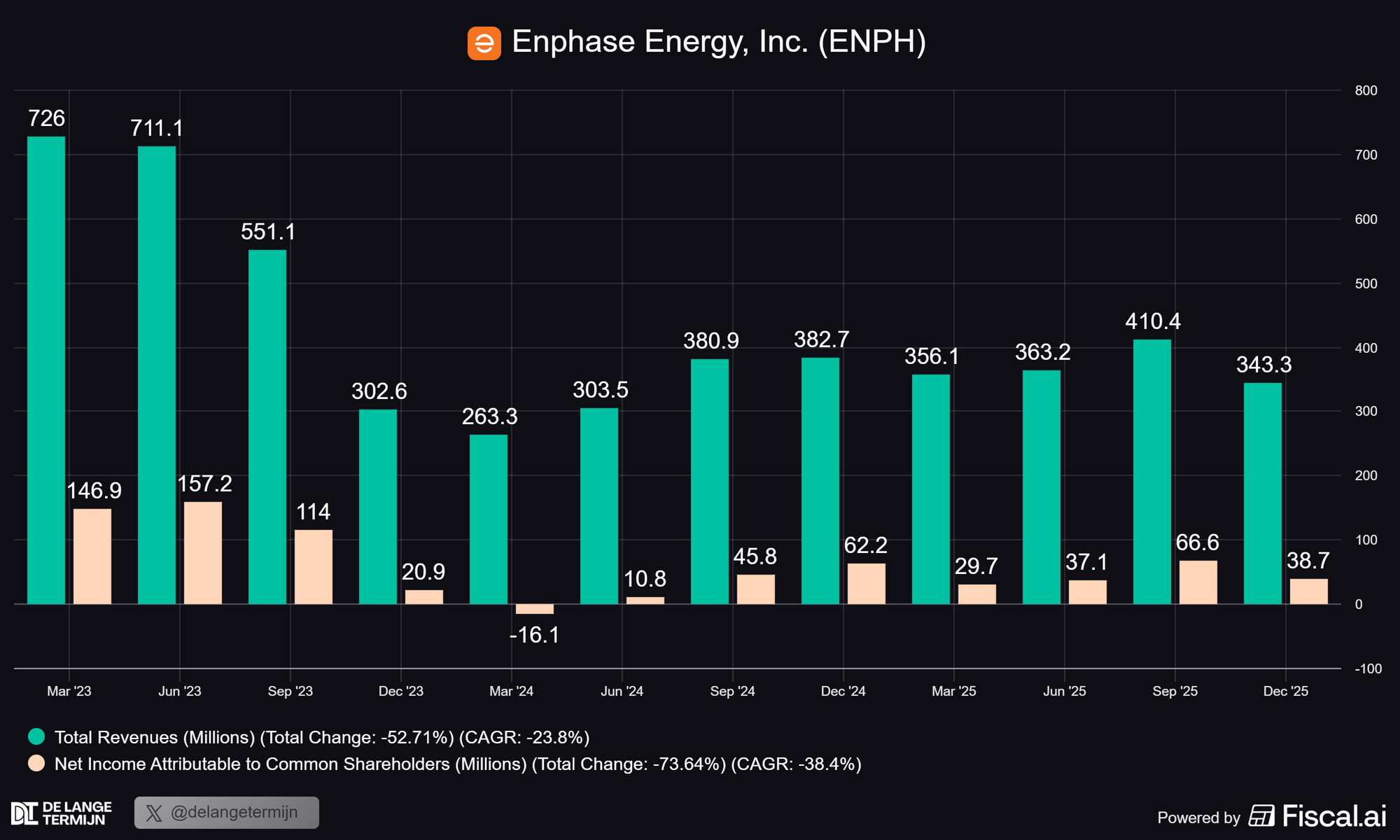 Echter, nadat de subsidies op groene energie in de VS langzaam werden teruggedraaid en de aandacht voor klimaat begon af te nemen, merkte Enphase dit ook in de cijfers. Met vele kwartalen aan teleurstellende resultaten, waarna de koers ruim 90% daalde sinds begin 2023. Zeer pijnlijk.