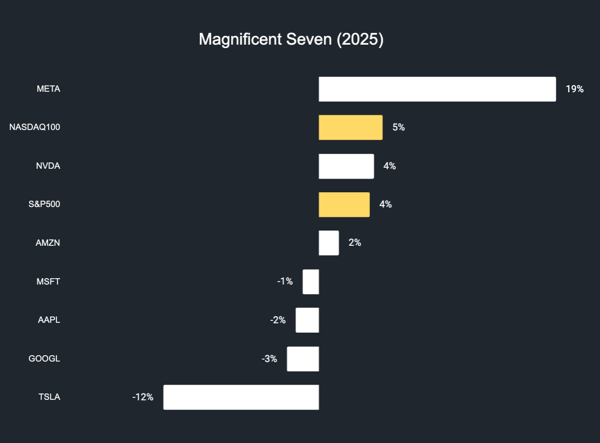 De MAG7 doen gezamenlijk hetzelfde als de Nasdaq 100 en S&P500 (4-5%). Waarbij de twee indices deze week even een nieuwe ATH neerzette.