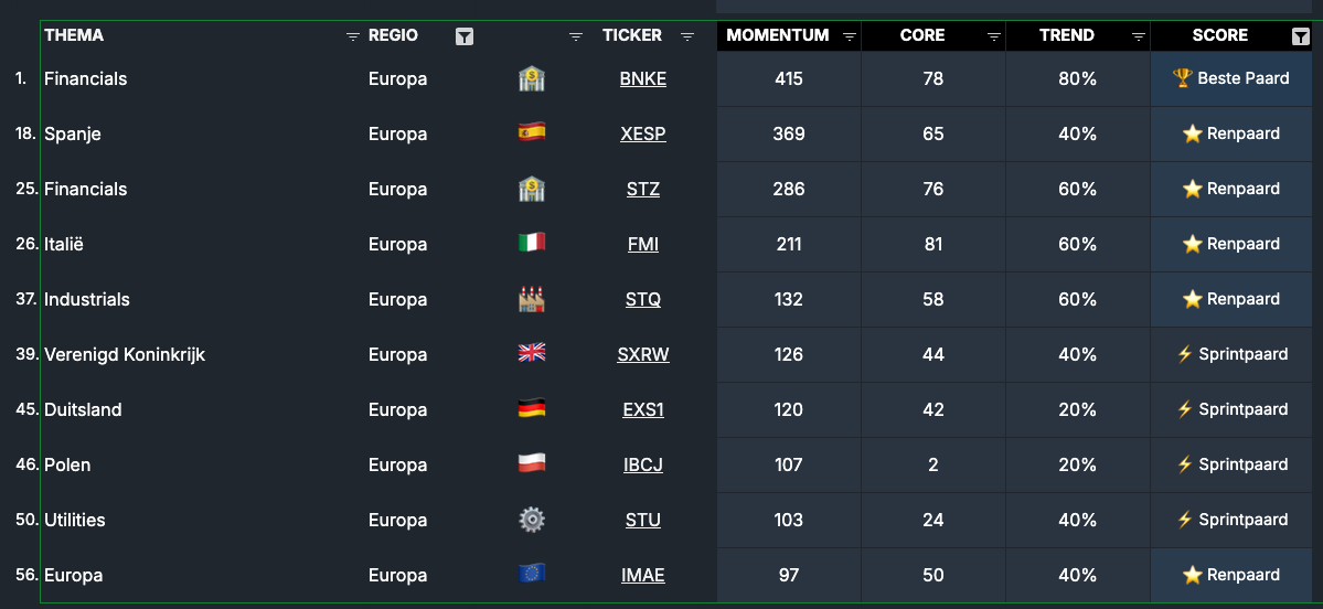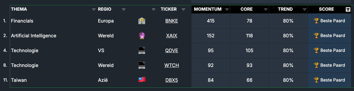 Allereerst de BNKE ETF (Financials Europa). Deze ETF steeg de afgelopen 12 maanden met 69%. Maar is daarmee niet zomaar een speculatieve hoogvliger. Het dashboard bestempeld dit fonds als "Beste Paard" (🏆), wat betekent dat het niet alleen sterk groeide, maar ook stabiel is.