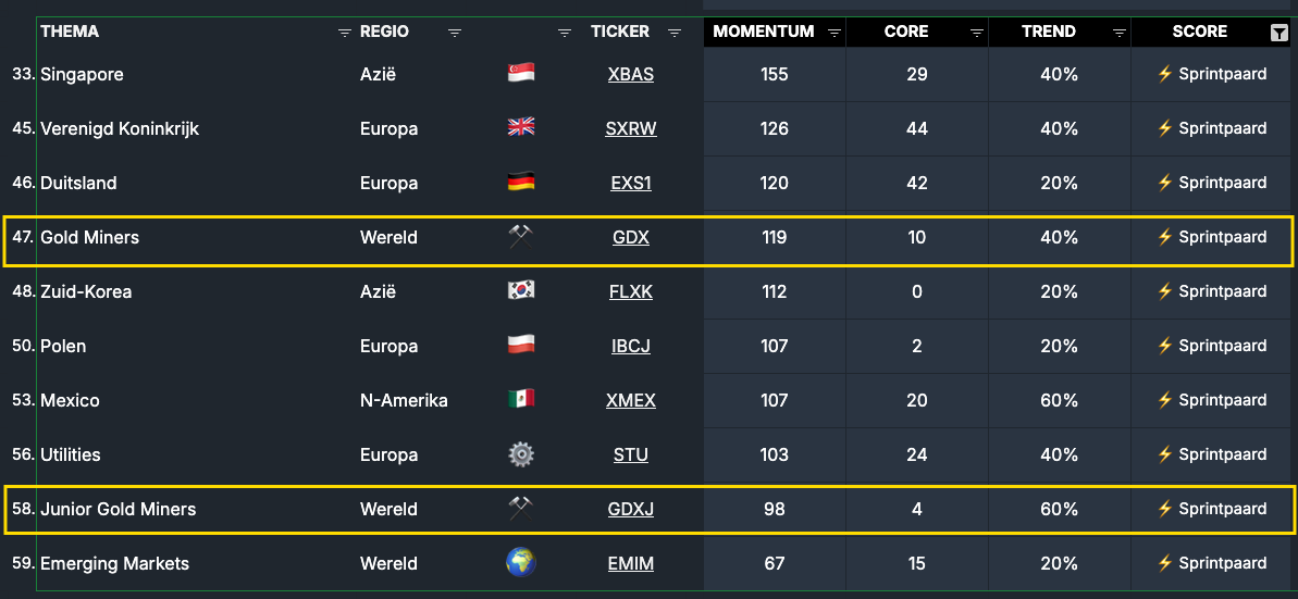Hier zit echter een belangrijke les. Kijk naar de Gold Miners (GDX en GDXJ): die vlogen in de afgelopen 12 maanden met 60-80% omhoog! Bizar, toch? Maar het dashboard classificeert ze als "Sprintpaard" (⚡️).