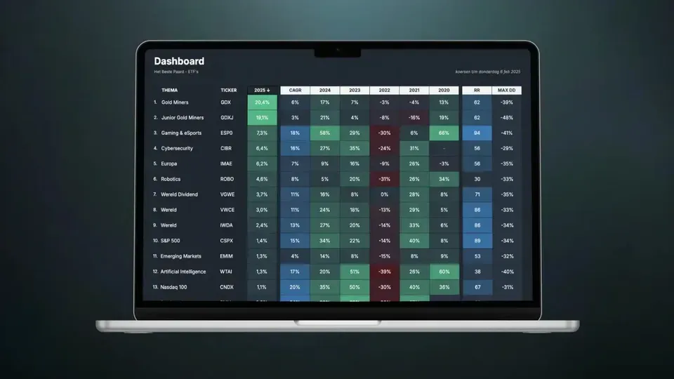 Wil je niet dagelijks naar de grafieken staren, dan is ons dashboard jouw kompas. Het toont je welke paarden (ETF's) kunnen rennen, welke blijven rennen en welke keer op keer op hun bek gaan of blijven hangen in de stal.